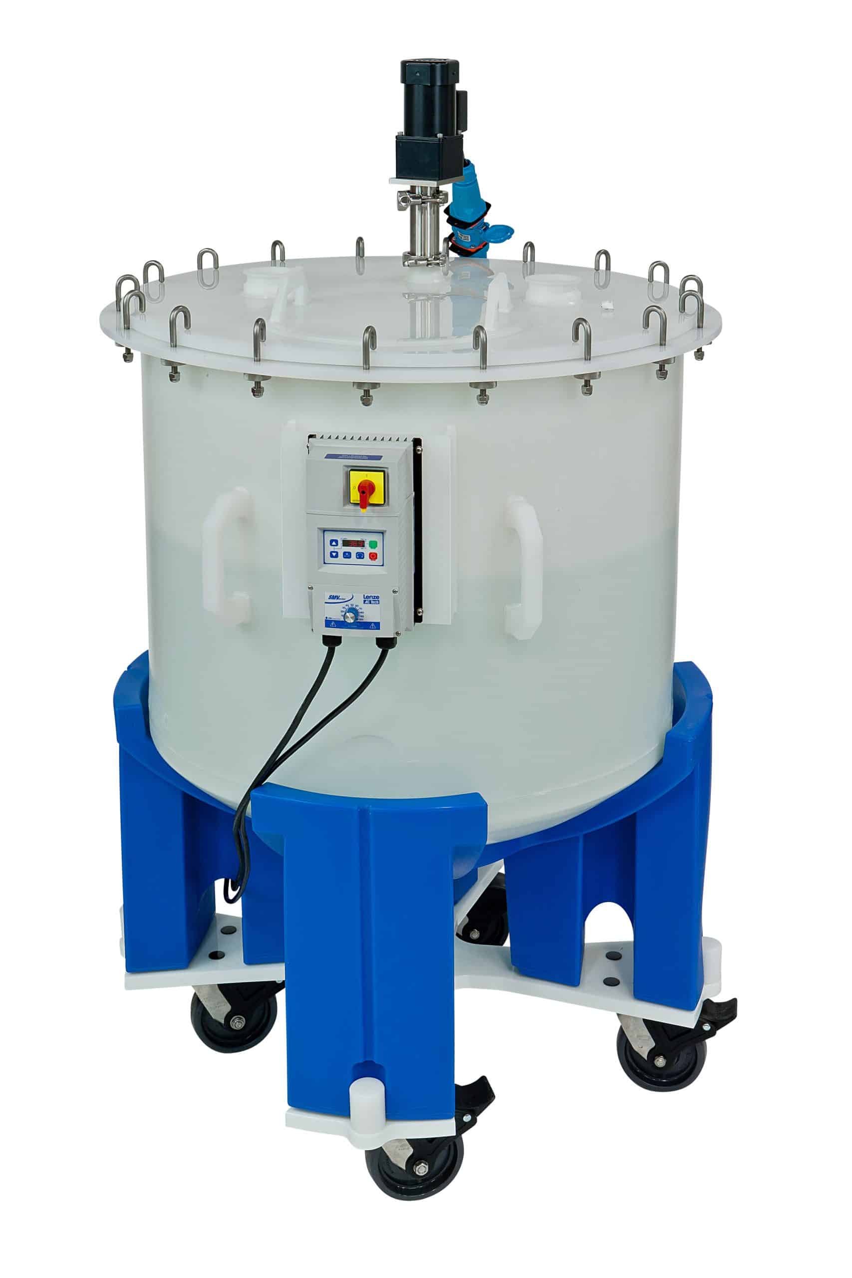 This was built for a customer in biopharma as a buffer prep mixtank, for dissolving salts and other solids into solution. Very rapid dissolving was desired, and speed controller integrated into this poly tank on castors.