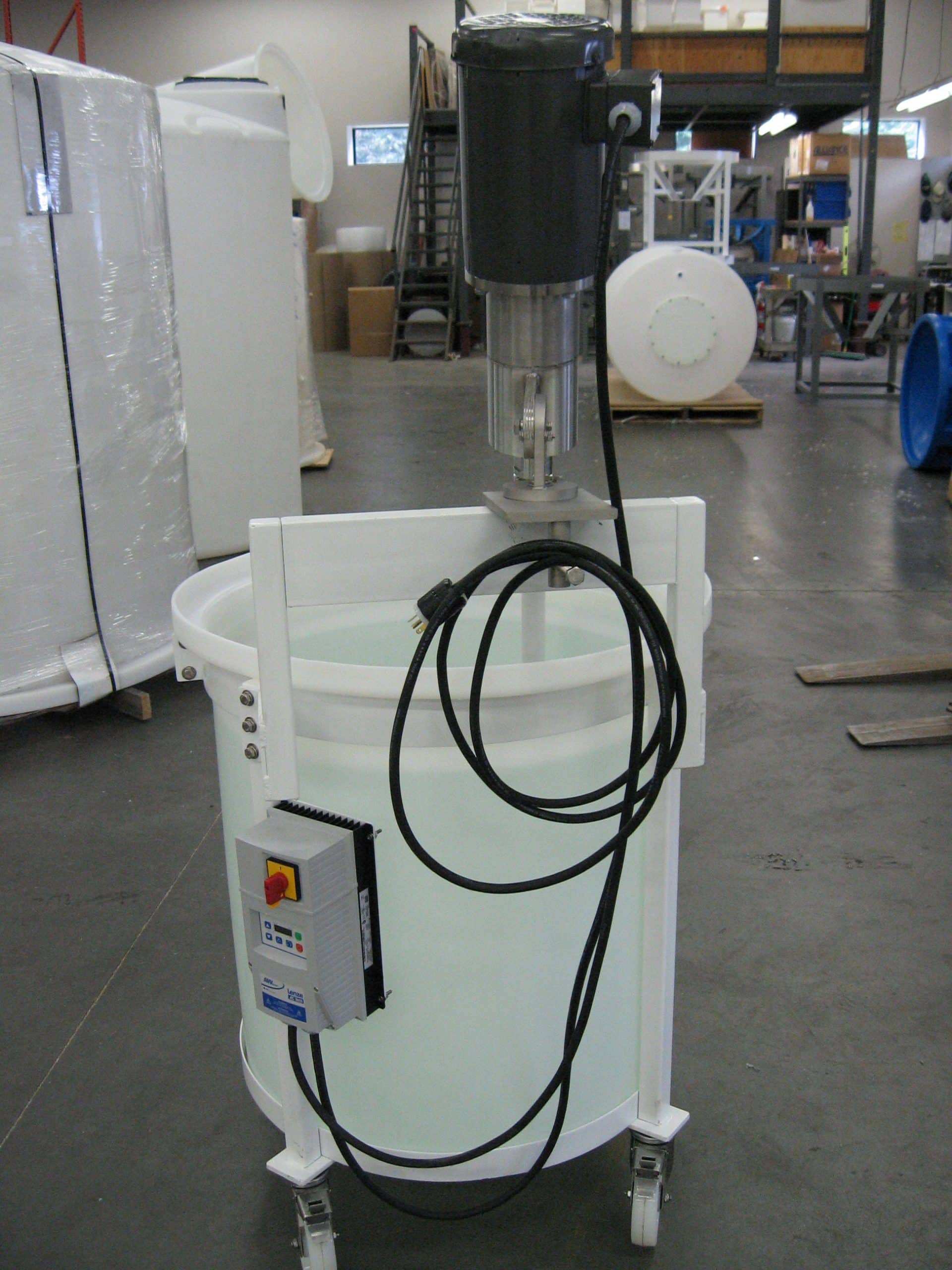 Custom poly mixing tank for corrosive mixtures. Heavy duty motor mount provides ultra stable support for the top entry mixer.
