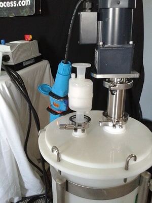 Applications: Top view of poly process vessel with some TC ports and some flush mount sanitary connections. Autoclave style mixer is shown, where mixer motor easily removes and mixer/tank can be autoclaved and sterilized together. Was built for customer who was blending final sterile product in plastic blend tank